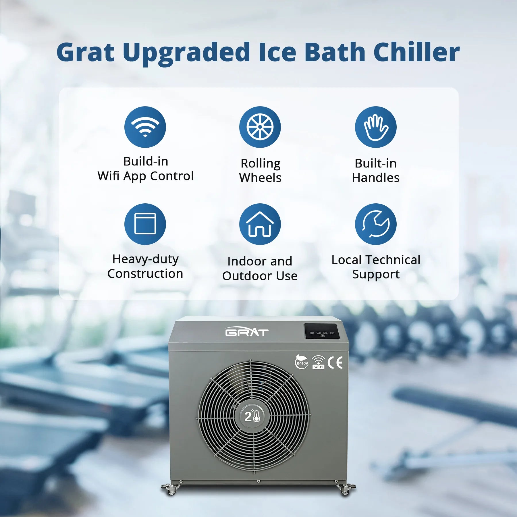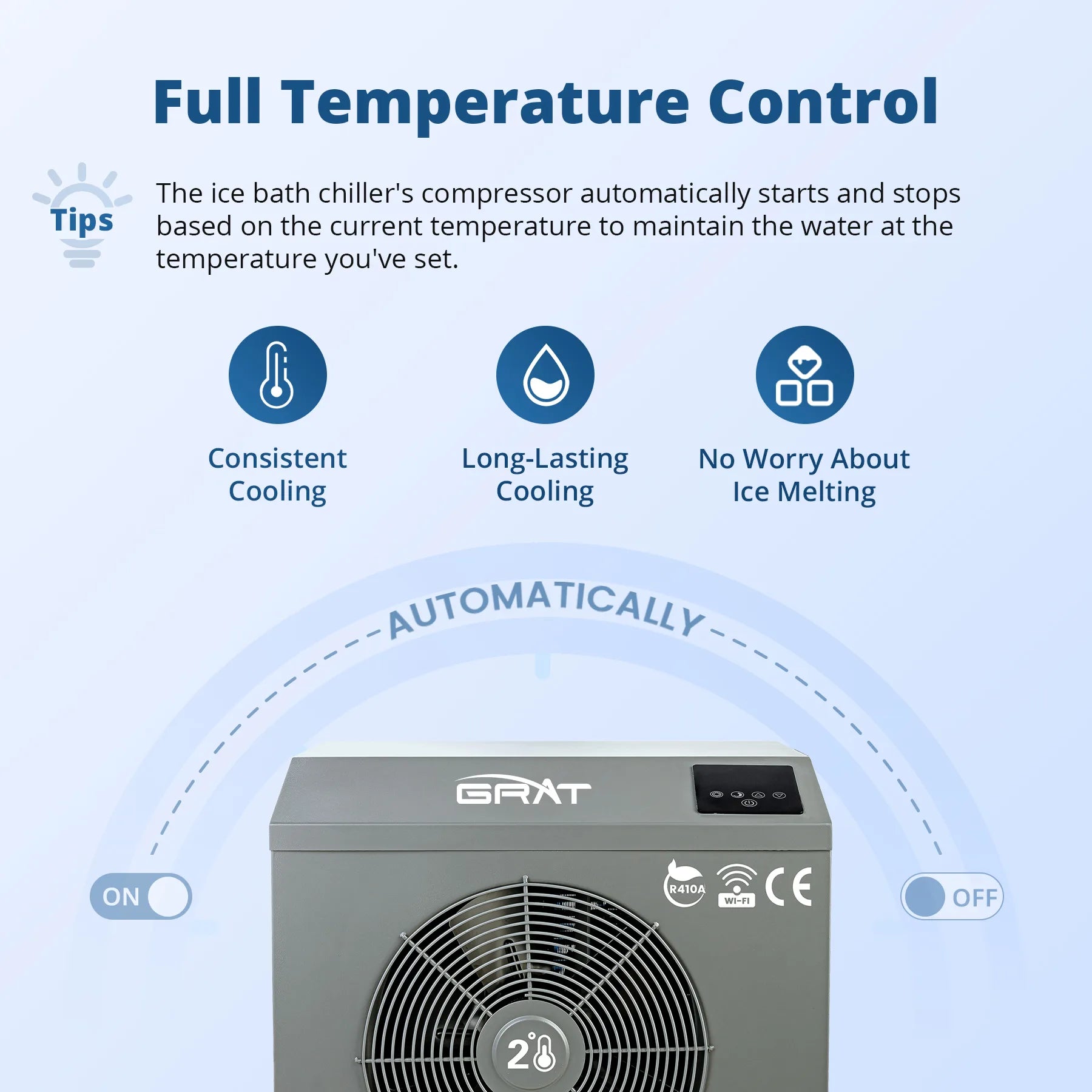 GRAT’s Ice Bath Set includes a portable cold water chiller and a portable plunge tub. With adjustable water temperature control down to a chilling 2 degrees, it’s perfect for daily cold water baths and therapeutic ice baths at home. Highly efficient and remotely controllable. Enjoy peace of mind and effortless shopping with our one-click purchase option!